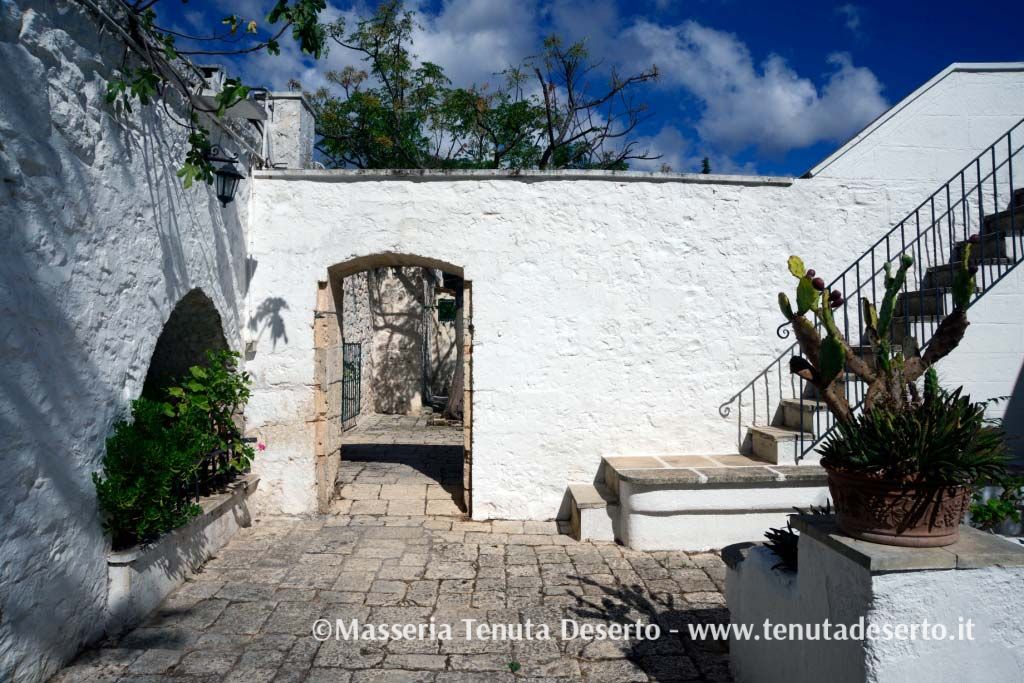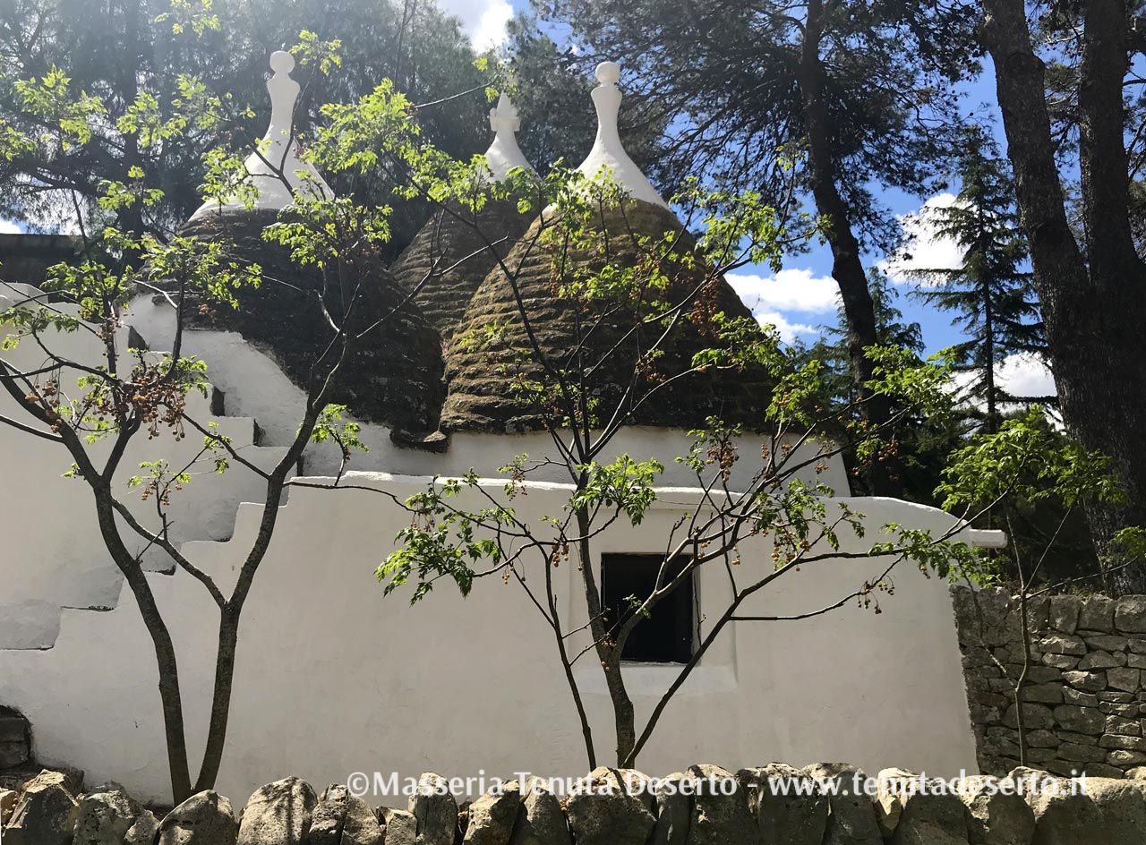 The Masseria Tenuta Deserto is a southern italian estate extended 180 acres of beautiful farm land surrounded by woods of Live Oak, Eucalyptes, Pines and Olive trees. Here, in this warm Mediterranean region, bathed by the sun and cooled by soft sea breezes, you will encounter, located in the center of estate, a lovely Masseria own by the current family since the end of 1700. The Masseria was constructed during successive periods starting from late middle-age (XV century) to mid 1800 includes a Main House, a late middle-age Tower, rural facilities, stables and stores all restored in comfortable and fully equipped houses, a Chapel, a characteristic Trullo, typical house of Puglia, a swimming pool 15x7 m and a swimming pool 6x3 m for children, a Club House where guests can enjoy typical dinners and a Wine Bar where a selection of region's wines can be tasted. Guests can live in one of 13 houses ranging from Il Melograno, the main and the largest with its airy loggia, to the trullo named L'Oleandro.