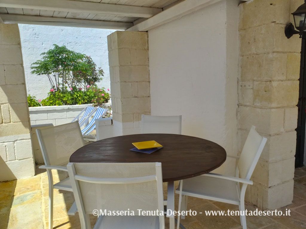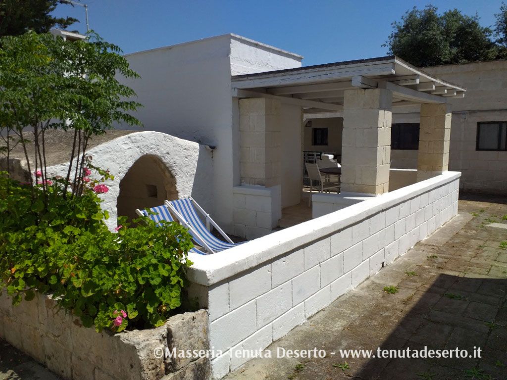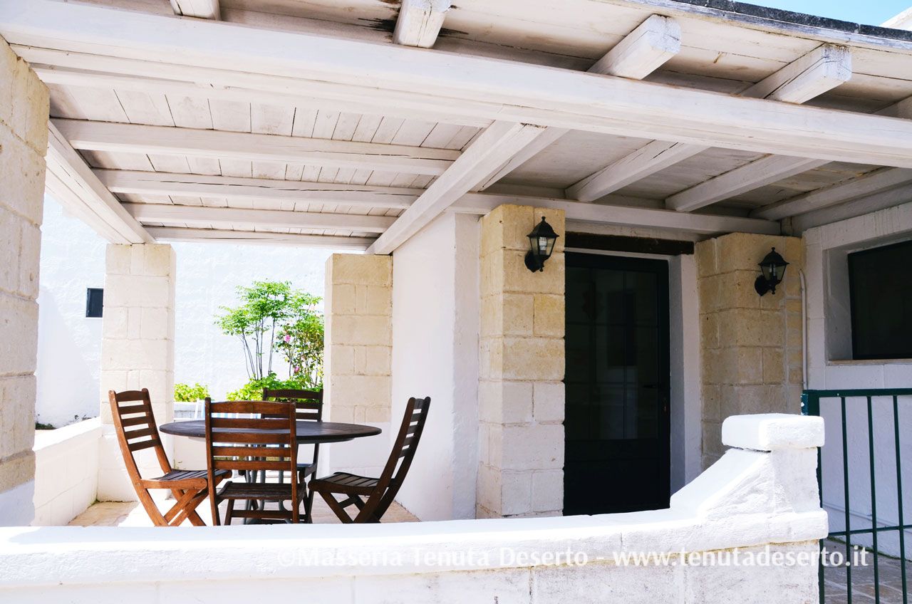 Ingresso, sala da pranzo, cucina a vista attrezzata, soggiorno con due divani letto singoli e TV, camera matrimoniale, bagno con doccia, ampia veranda esterna con tavolo, sedie e sdraio. La casa è dotata di aria condizionata.