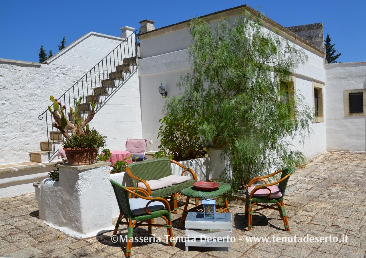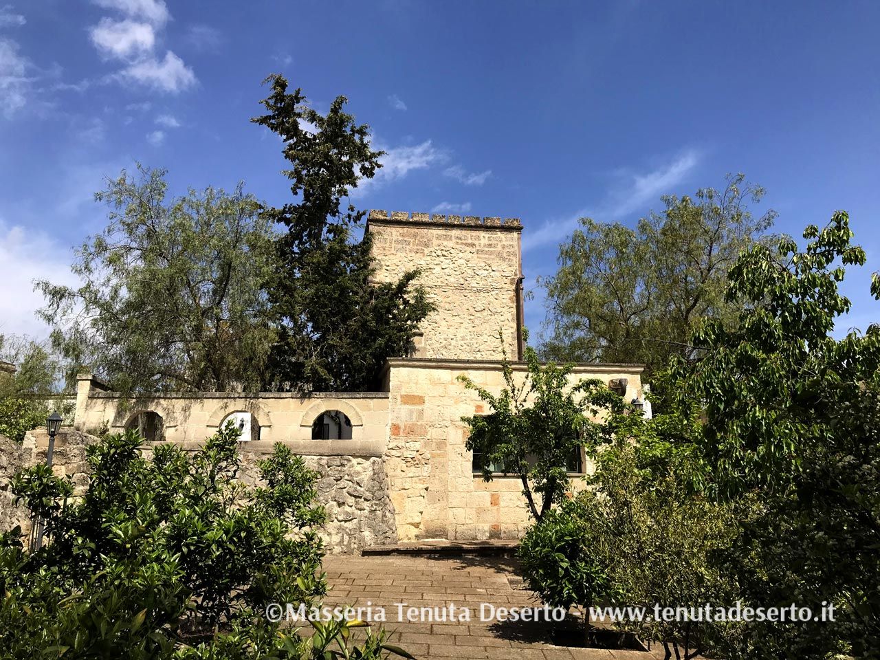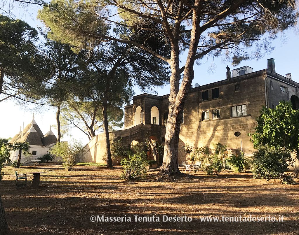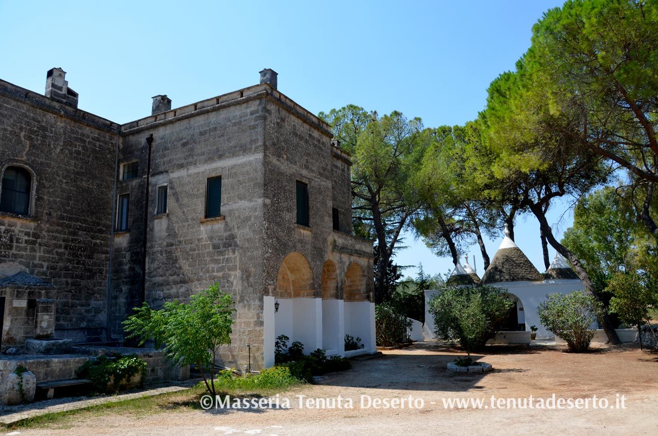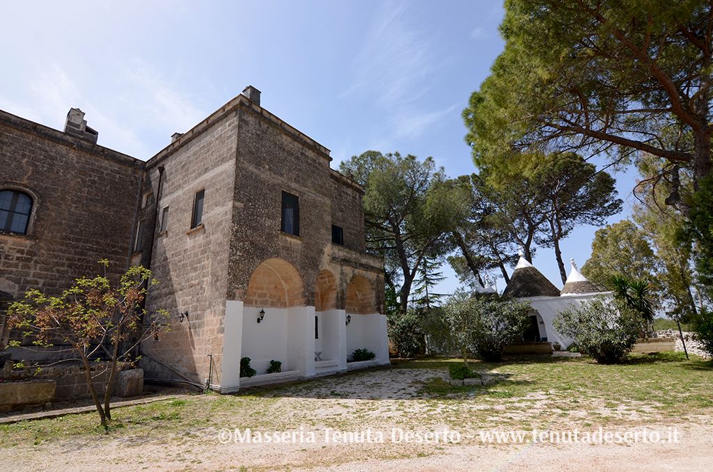 La Masseria Tenuta Deserto, situata a 4 Km da San Vito dei Normanni, a 15 Km da Ostuni e a 12 Km dalle spiagge di Torre Guaceto, area protetta dal WWF, nella stupenda e suggestiva campagna pugliese, vi accoglie nei suoi 75 ettari di uliveti, seminativi, pascoli e boschi di querce e lecci. La Masseria, situata al centro della Tenuta, è stata costruita in periodi successivi dal tardo medioevo alla metà dell'800 e la proprietà si tramanda fino ad oggi dalla fine del 700. La Masseria comprende la Torretta tardo medievale, la Casa Principale, la Club House, un caratteristico Trullo, la Cappella, antichi fabbricati rurali, le corti per il ricovero degli animali, e rappresenta da sempre quel classico ambiente rurale che in Puglia prende proprio il nome di Masseria. Tutti i fabbricati sono oggi ristrutturati in confortevoli abitazioni.